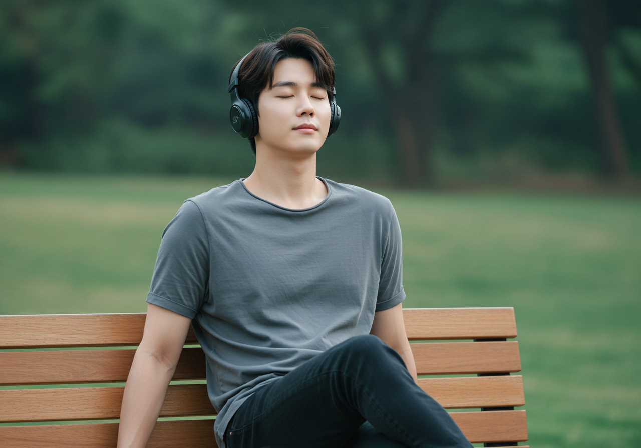 사진 설명: 이어폰을 낀 채 눈을 감고 평온한 표정으로 앉아 있는 사람
