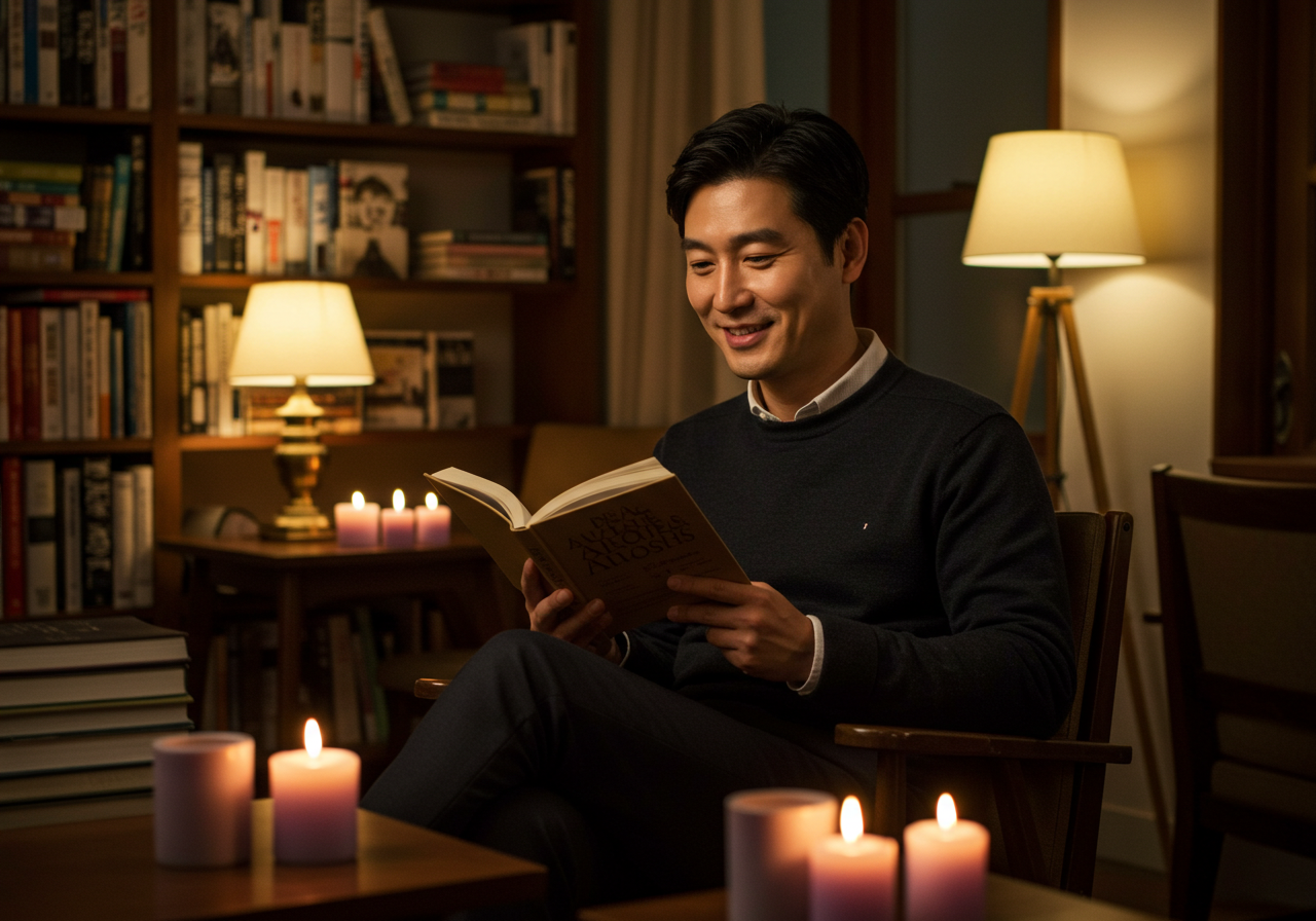 사진 설명: 라벤더 아로마 캔들이 켜진 조용한 저녁의 독서 공간